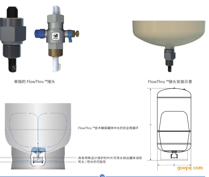 压力罐集成FlowThru™适配器接头能够在水泵运行的同时使水进入罐体,更重要的是还将水排出罐体,这种不断的冲洗功能保证了罐体中的水质新鲜优良且消除了一般系统中死水/积水的可能性。